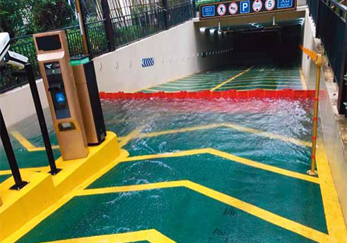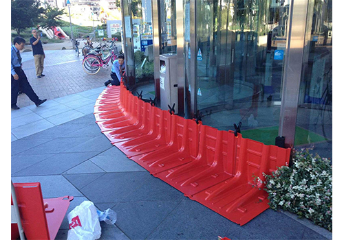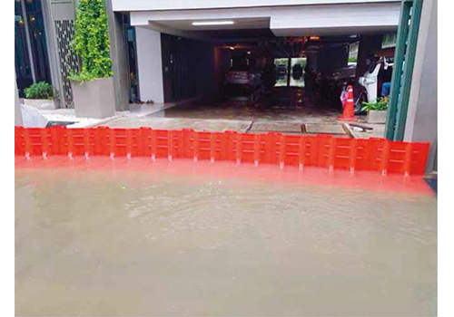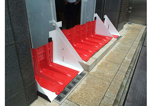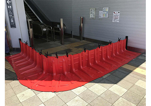 水圧を利用した固定方法で特殊な工具は不要、ジョイント部分を接続して地面に置くだけの簡単敷設で、ゲリラ豪雨や台風などの水害から資産を守ります。